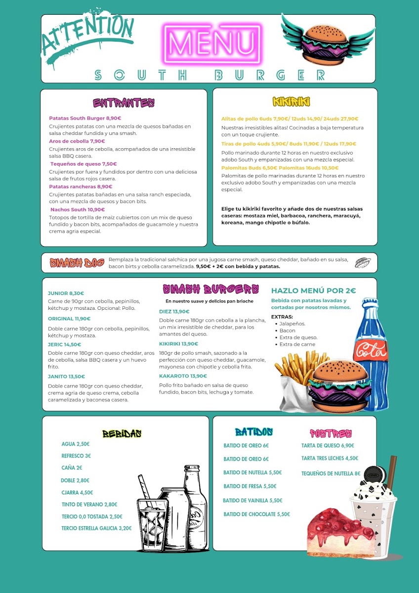 Introducing the menu at South Burger, a vibrant hamburger restaurant located in Getafe, Madrid, where flavor and fun collide. This establishment prides itself on crafting delectable smash burgers, with the standout SPECIAL SOUTH featuring a juicy 180g beef patty, cheddar cheese, caramelized onions, and crispy bacon bits—all embraced in a soft brioche bun for just €12.90. Pair your meal with their irresistible custom sauces, like the MAYOBACON, adding a savory twist for just €0.90.